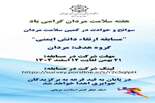 به گزارش روابط عمومی معاونت بهداشت دانشگاه علوم پزشکی دزفول، گروه جوانی جمعیت، سلامت خانواده و مدارس معاونت بهداشت دانشگاه علوم پزشکی دزفول، به مناسبت هفته سلامت مردان، مسابقه‌ای بصورت پرسشنامه آنلاین برگزار می‌کند.
