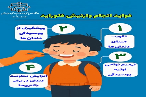 ️وی در ادامه افزود: فلوراید یک ماده معدنی طبیعی است که با تقویت مینای دندان، مقاومت آن را در برابر باکتری‌ها و اسیدهای مخرب افزایش داده و حتی می‌تواند نواحی اولیه پوسیدگی را ترمیم کند. وارنیش فلوراید شکلی از فلوراید است که توسط دندان‌پزشک یا مراقب سلامت روی سطح دندان‌ها مالیده می‌شود.
