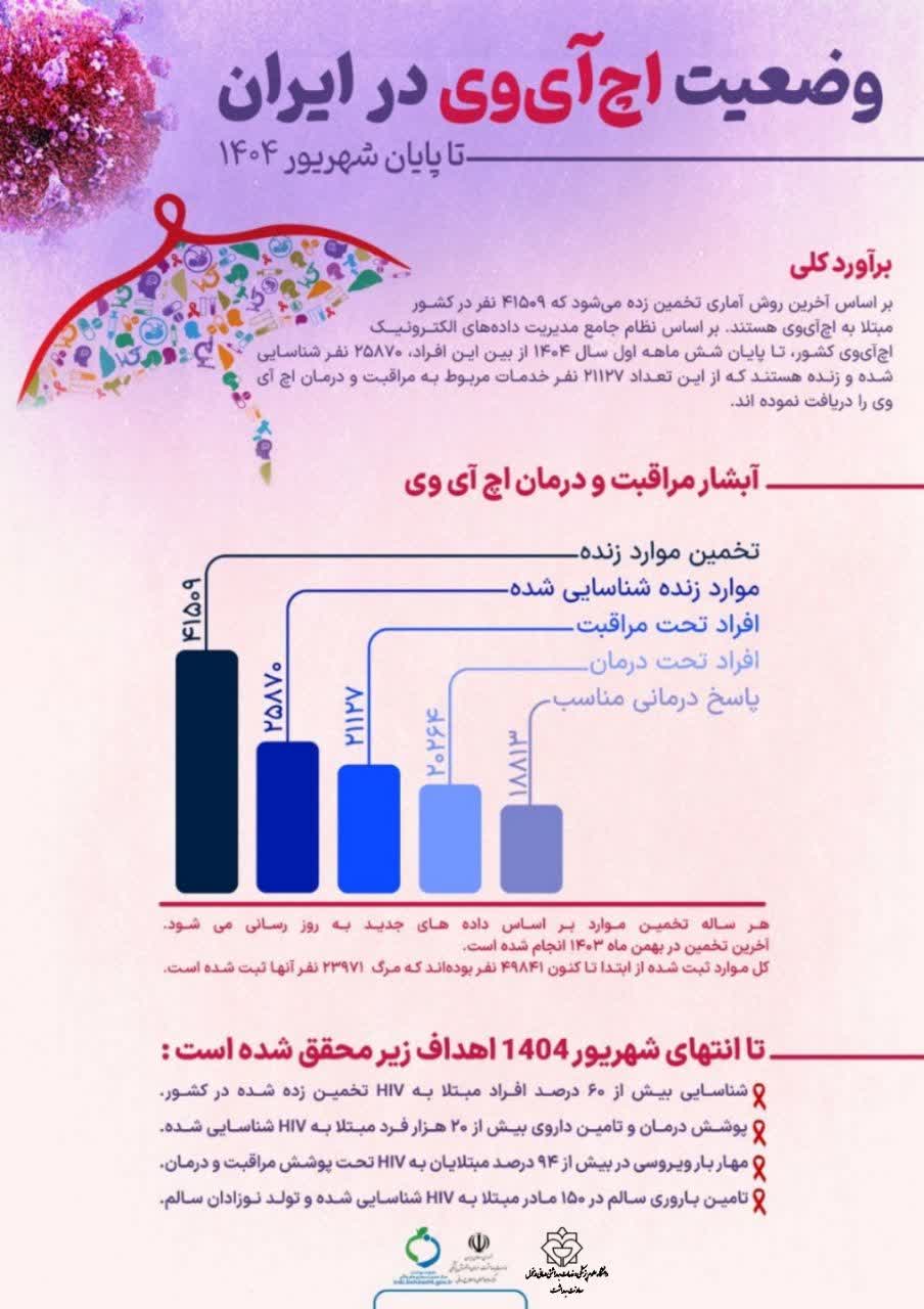 روابط عمومی معاونت بهداشت دانشگاه علوم پزشکی دزفول وضعیت اچآیوی در ایران تا پایان شهریور ۱۴۰۴ 1404/09/01 - 08:01 - تعداد بازدید: 49 - کد خبر : 19692 - گروه خبری : اخبار معاونت بهداشتی - تعداد نظرات : 0