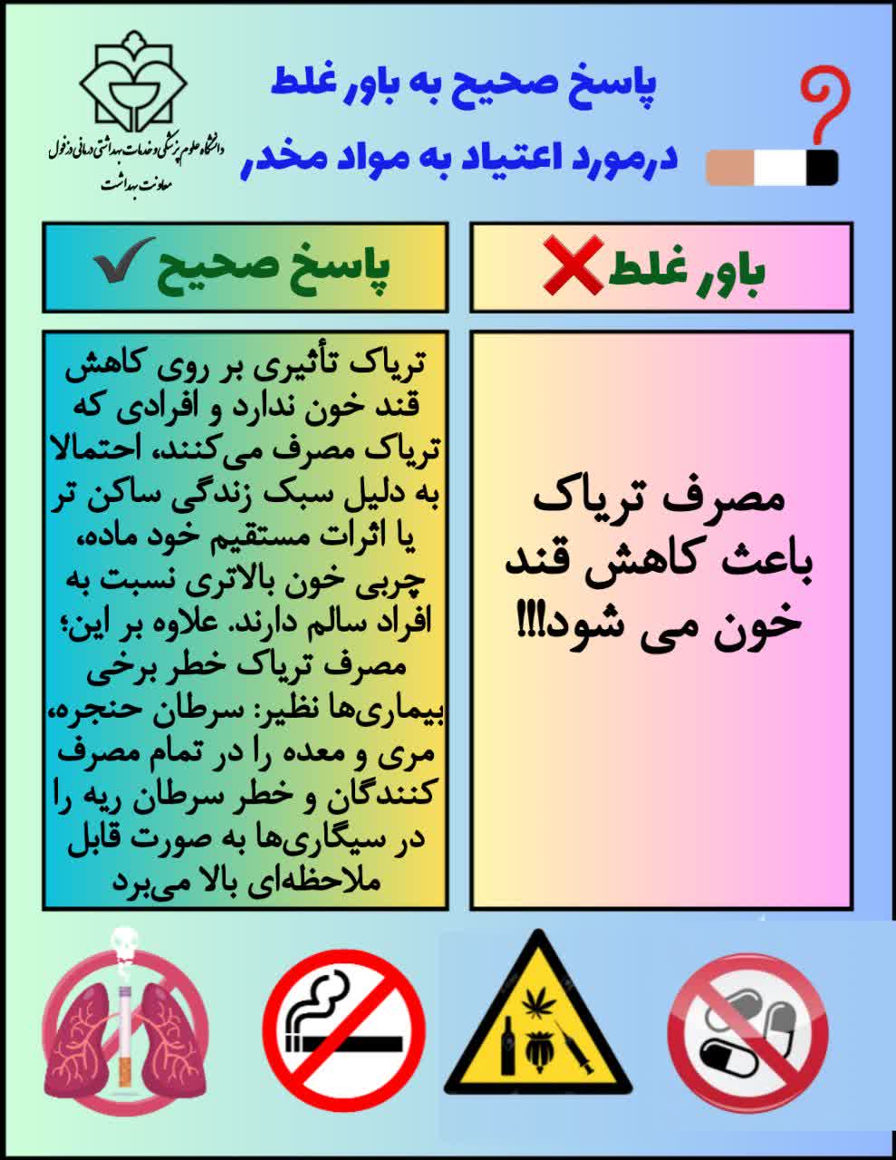روابط عمومی معاونت بهداشت دانشگاه علوم پزشکی دزفول پاسخ صحیح به باور غلط درمورد موادمخدر 1404/09/02 - 07:42 - تعداد بازدید: 43 - کد خبر : 19706 - گروه خبری : اخبار معاونت بهداشتی - تعداد نظرات : 0