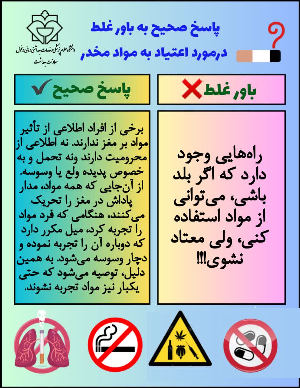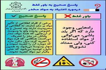 روابط عمومی معاونت بهداشت دانشگاه علوم پزشکی دزفول پاسخ های صحیح به باورهای غلط درمورد اعتیاد به مواد مخدر 1404/08/25 - 09:11 - تعداد بازدید: 69 - کد خبر : 19656 - گروه خبری : اخبار معاونت بهداشتی - تعداد نظرات : 0 ۲۲ لغایت ۲۸ آبان ماه، هفته ملی مبارزه با اعتیاد و آسیبهای اجتماعی گرامی باد.