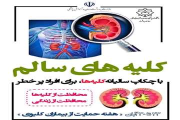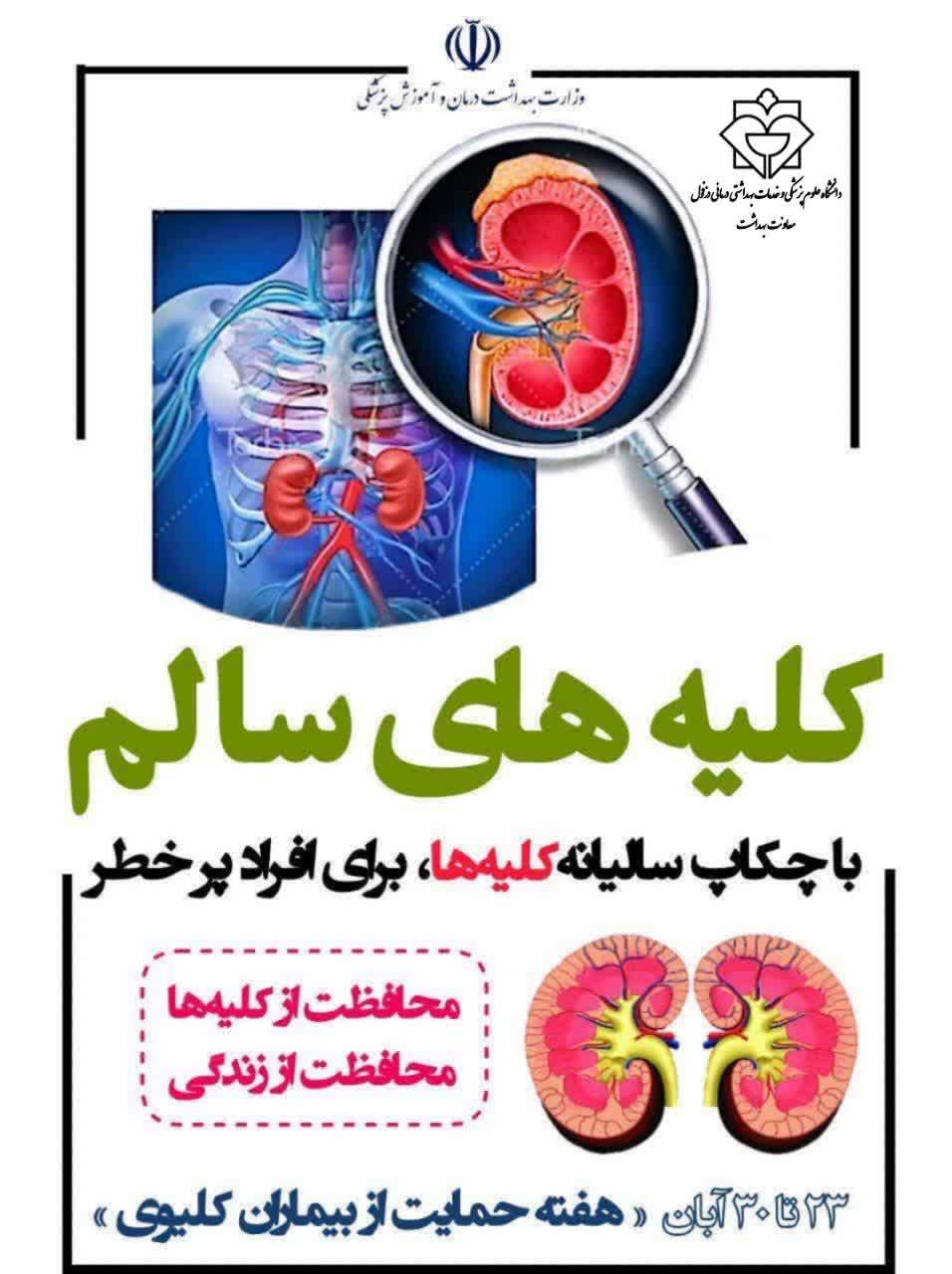 روابط عمومی معاونت بهداشت دانشگاه علوم پزشکی دزفول کلیههای سالم؛ با چکاپ سالیانه کلیهها برای افراد پرخطر، از کلیههای خود محافظت کنید 1404/08/27 - 08:26 - تعداد بازدید: 57 - کد خبر : 19671 - گروه خبری : اخبار معاونت بهداشتی - تعداد نظرات : 0 محافظت از کلیهها، محافظت از زندگی هفته حمایت از بیماران کلیوی، ۲۳ لغایت ۳۰ آبان ماه گرامی باد.