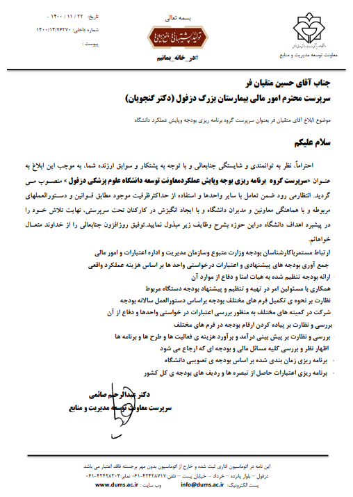 با ابلاغ معاون توسعه دانشگاه علوم پزشکی دزفول حسین متقیان فر به سرپرستی گروه برنامه ریزی بودجه و پایش عملکرد دانشگاه علوم پزشکی دزفول منصوب شد.