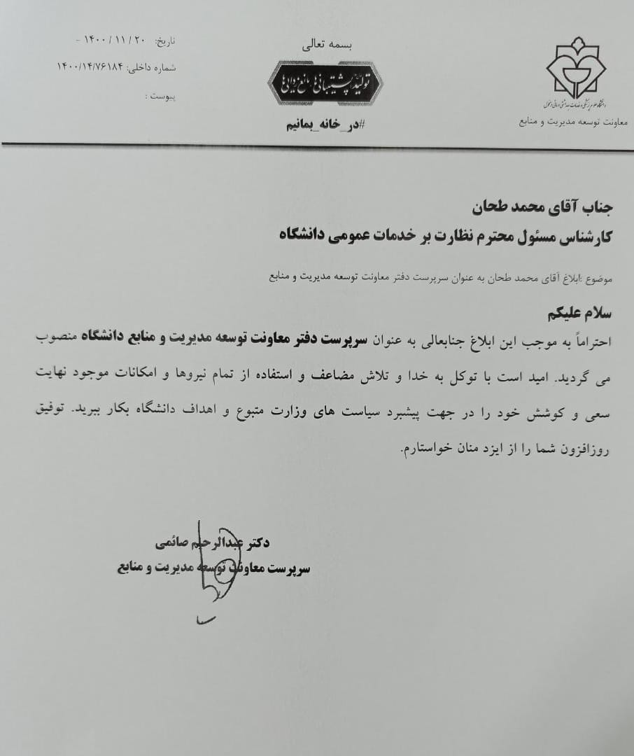 محمد طحان سرپرست دفتر معاونت توسعه مدیریت و منابع دانشگاه منصوب شد