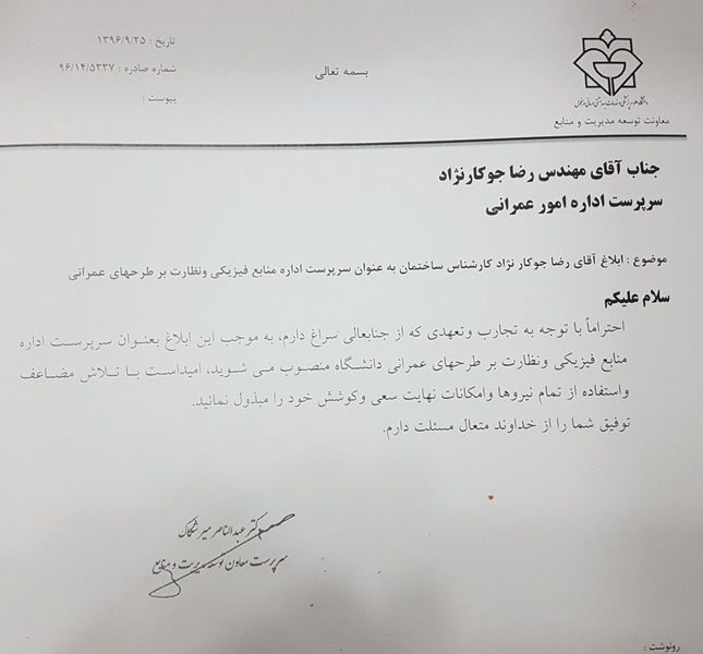 دکتر میرشکاک معاون توسعه دانشگاه طی ابلاغی مهندس جوکار نژاد را بعنوان سرپرست اداره منابع فیزیکی منصوب کرد.