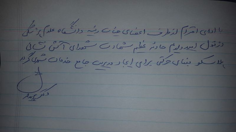 دکتر یوسف پریدار رئیس دانشگاه علوم پزشکی دزفول در دفتر یاد بود آتش نشانی دزفول نوشت: