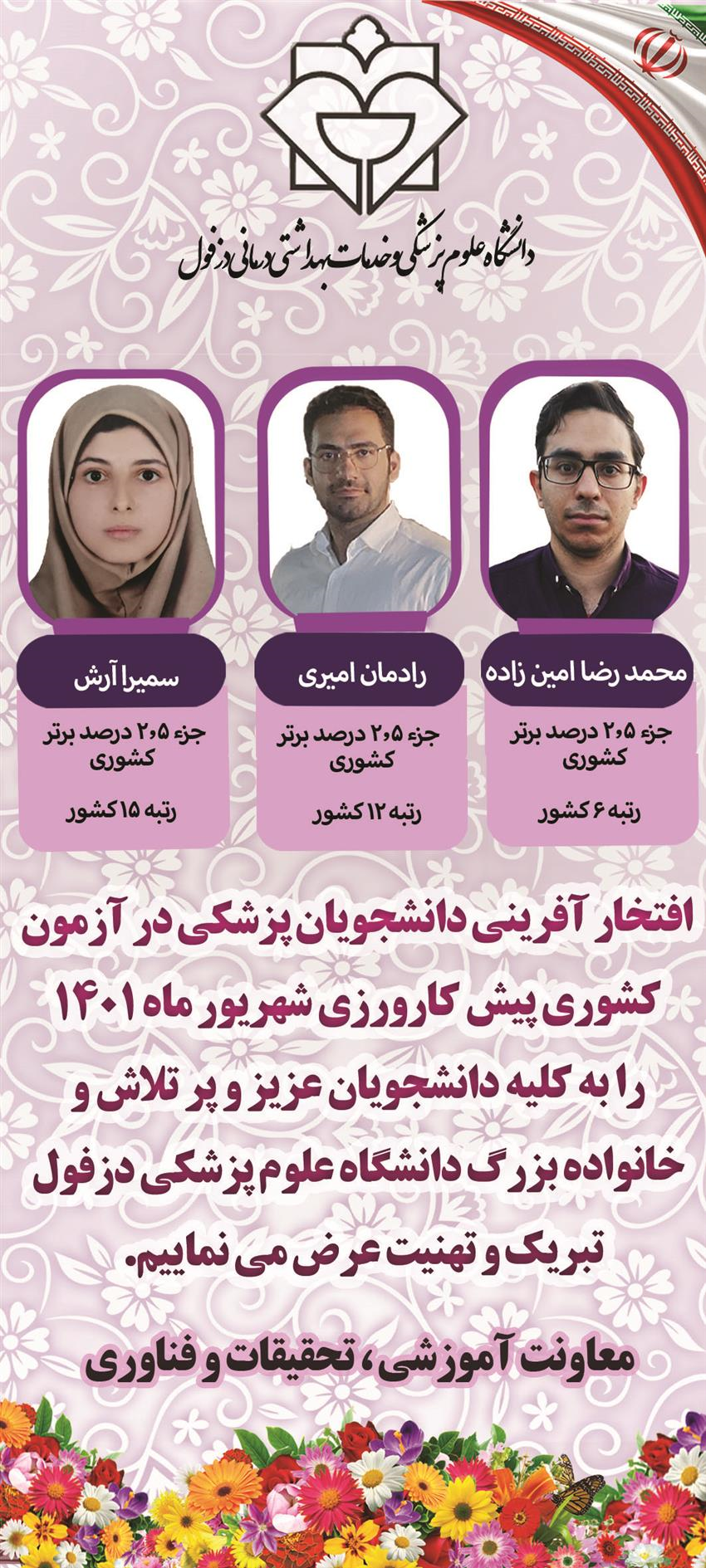 دکتر محمد امین بهمنش معاونت آموزشی، تحقیقات و فناوری دانشگاه اظهار داشت: پس از اعلام نتایج نفرات برتر آزمون فوق توسط وزارت بهداشت در آذر ماه، خوشبختانه مشخص گردید 3 نفر از دانشجویان پزشکی ورودی سال 1395 این دانشگاه، آقایان "محمد رضا امین زاده" و "رادمان امیری" و خانم "سمیرا آرش" علاوه بر اینکه جز 2.5 درصد برتر کشور تعیین شدند، بترتیب با کسب رتبه های 6، 12 و 15 کشوری از میان بیش از 3000 نفر دانشجوی پزشکی متقاضی آزمون فوق در کل کشور، افتخاری بزرگ برای دانشگاه علوم پزشکی دزفول به ارمغان آوردند.