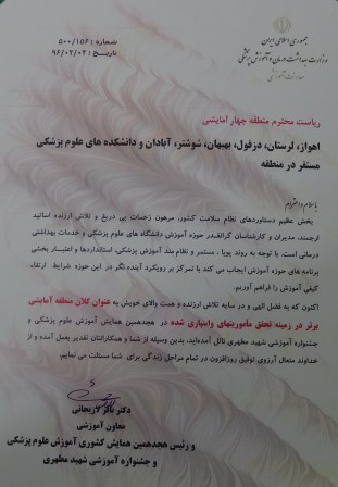 اکنون که به فضل الهی و در سایه تلاش ارزنده و همت والای خویش به عنوان کلان منطقه آمایشی برتر در زمینه تحقق ماموریتهای واسپاری شده در هجدهمین همایش آموزش علوم پزشکی و جشنواره آموزشی شهید مطهری نایل آمده اید، بدین وسیله از شما وهمکارانتان تقدیر بعمل آمده و از خداوند متعال آرزوی توفیق روز افزون در تمام مراحل زندگی برای شما مسئلت می نمایم.