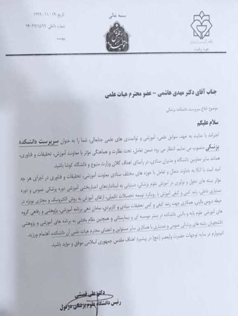 با ابلاغ دکتر قمیشی رئیس دانشگاه علوم پزشکی دزفول دکتر مهدی هاشمی سرپرست دانشکده پزشکی شد.