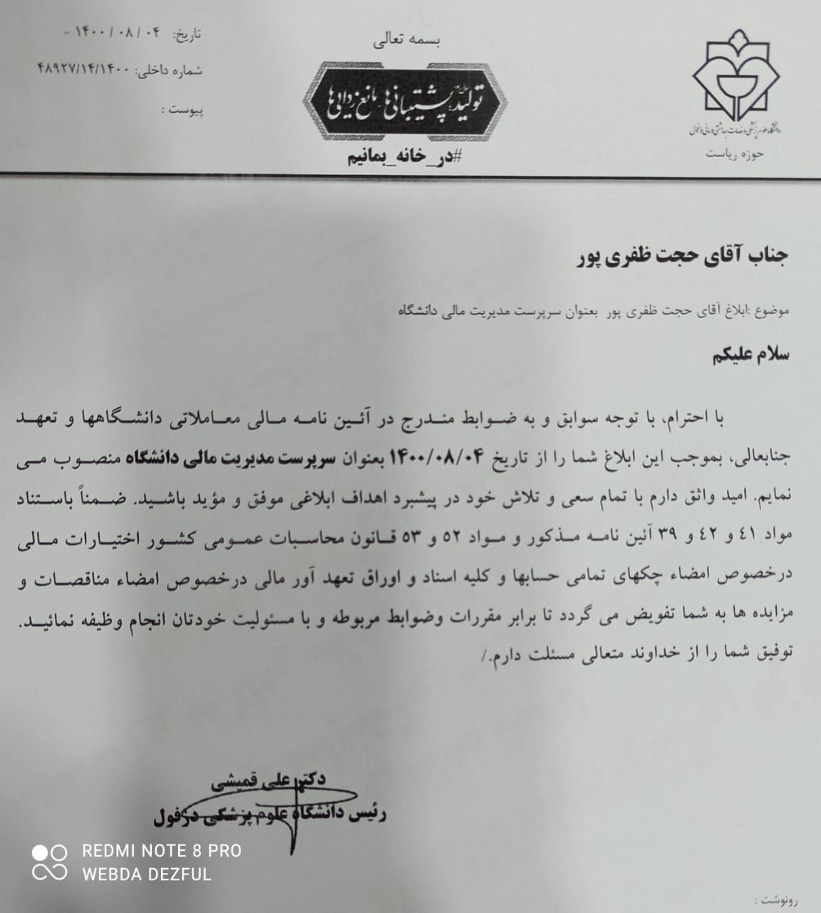 با ابلاغ رئیس دانشگاه علوم پزشکی دزفول سرپرست مدیریت مالی دانشگاه منصوب شد.