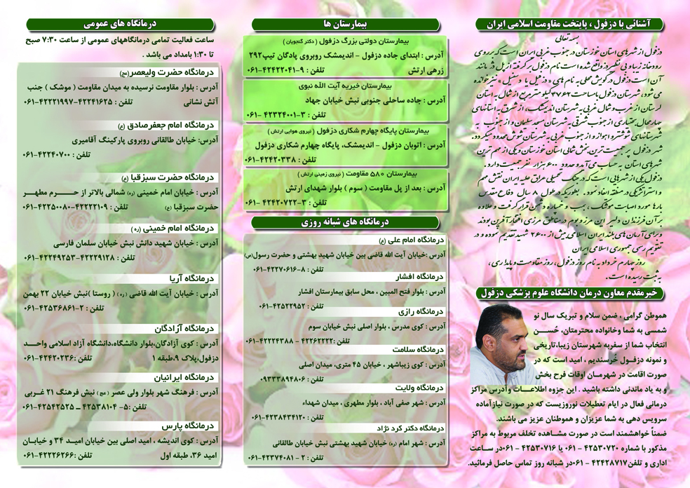 مسئول روابط عمومی معاونت درمان دانشگاه علوم پزشکی دزفول خبر داد:برای کسب اطلاعات بیشتر میهمانان نوروزی از مراکز درمانی فعال شهرستان دزفول در ایام نوروز 97 بروشوری آماده و در مبادی شهر توزیع می گردد.