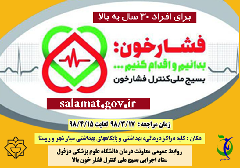 مسئول روابط عمومی معاونت درمان دانشگاه علوم پزشکی دزفول خبر داد:سامانه طرح ملی بسیج کنترل فشارخون بالا به آدرس salamat.gov.ir آماده ثبت اطلاعات فشارخون شماست.