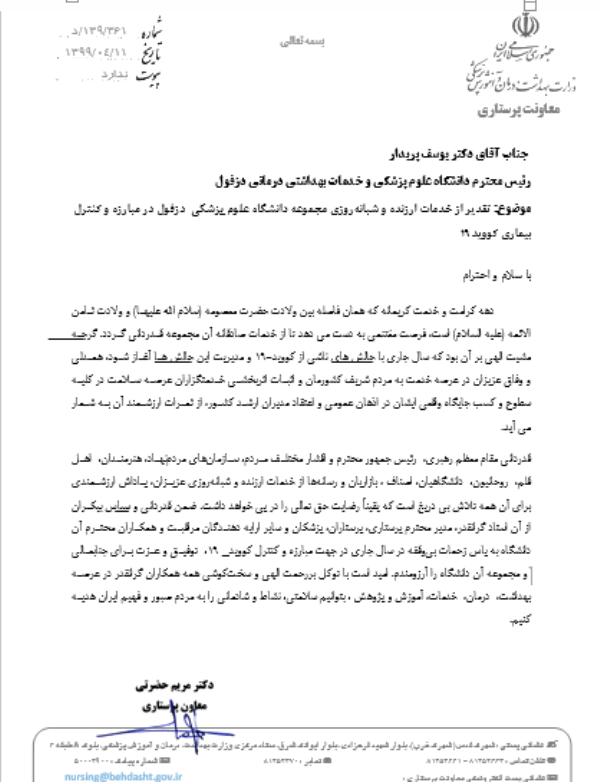 در بخشی از این نامه آمده است. ضمن قدردانی و سپاس بیکران از استاد گرانقدر، مدیر محترم پرستاری، پرستاران، پزشکان و سایر ارایه دهندگان مراقبت و همکاران محترم آن دنشگاه به پاس زحمات بی وقفه در سال جاری در جهت مبارزه و کنترل کووید 19 توفیق و عزت برای جنابعالی و مجموعه آن دانشگاه را آرزومندم.