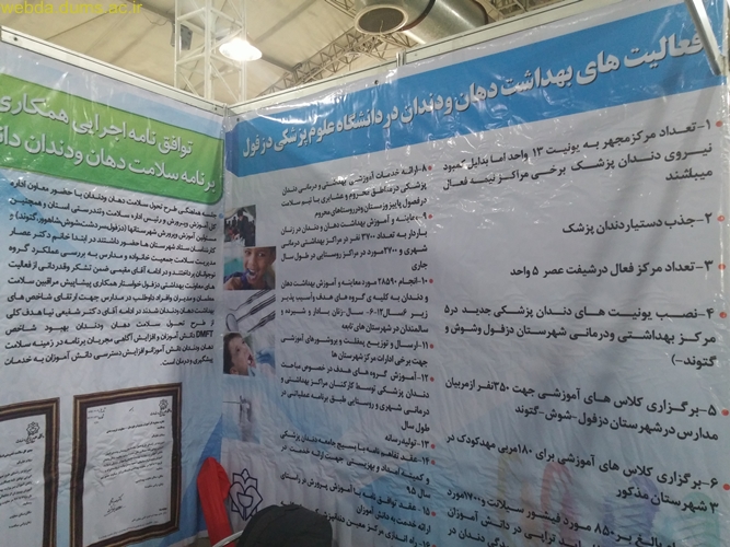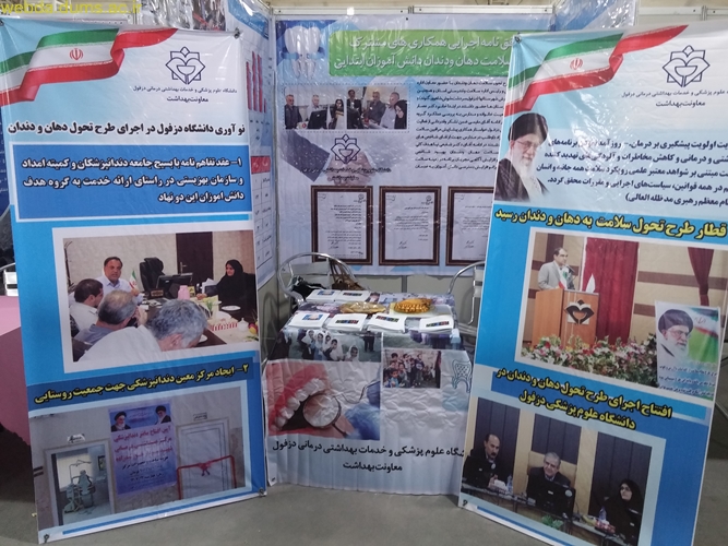 دکتر مهدیه توکلی معاون بهداشت دانشگاه علوم پزشکی دزفول با اعلام این خبر گفت:  در حوزه بهداشت بویژه در برنامه های بهداشت دهان و دندان اقدامات شایسته ای صورت گرفته است که با اختصاص غرفه به این حوزه اقدامات انجام شده در سطح دانشگاه را به نمایشگاه  منتقل کردیم معاون بهداشت دانشگاه گفت: