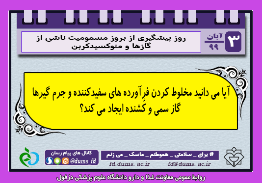 برای پانزدهمین سال متوالی هفته اول آبان توسط وزارت بهداشت،درمان و آموزش پزشکی هفته پیشگیری از بروز مسمومیت ها نامگذاری شده است و سوم آبان روز پیشگیری از بروز مسمومیت ناشی از گازها و منوکسیدکربن می باشد.