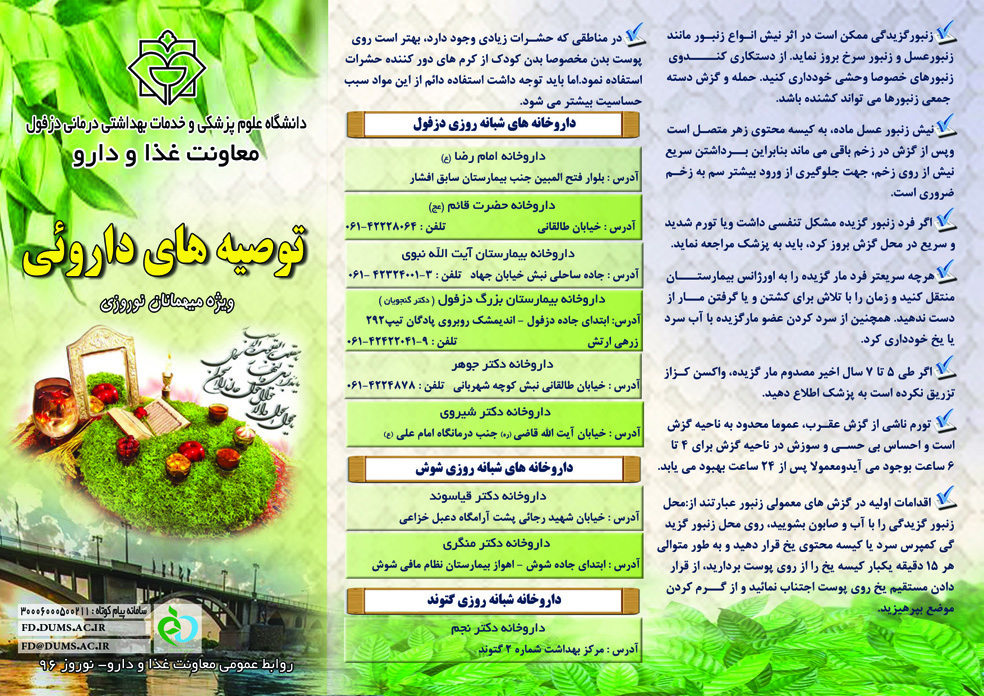 به نقل از روابط عمومی معاونت غذا و دارو ،داود سلمان پور، اظهار داشت: جهت ارتقای سطح علمی هموطنان و میهمانان نوروزی در پایتخت مقاومت ایران اسلامی ، دزفول قهرمان ، توصیه های داروئی به همراه برنامه کشیک نوروزی داروخانه های شبانه روزی شهرستان های دزفول ، شوش و گتوند و همچنین نکاتی در مورد مضرات استفاده از ظروف یکبار مصرف ، طراحی و چاپ گردیده است.