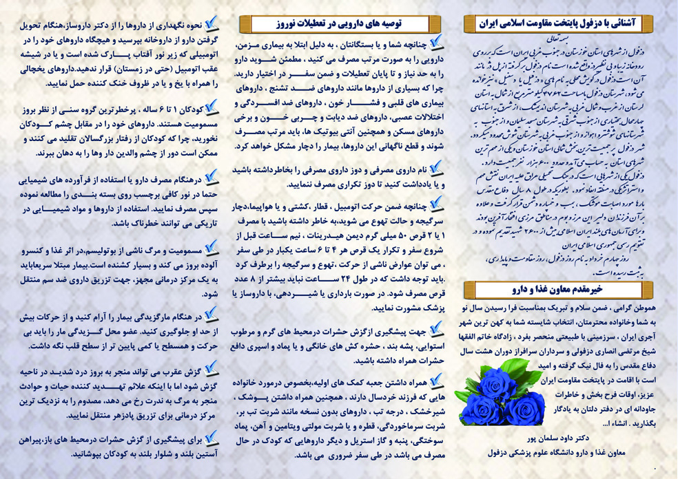 وی افزود : این ویژه نامه ها با همت کارشناسان داروئی این معاونت تهیه و توسط روابط عمومی معاونت غذا و دارو طراحی شد و با مجموع تیراژ 4000 عدد در ورودی ها و مراکز اسکان میهمانان نوروزی در شهرستان های دزفول،شوش و گتوند توزیع می گردد.
