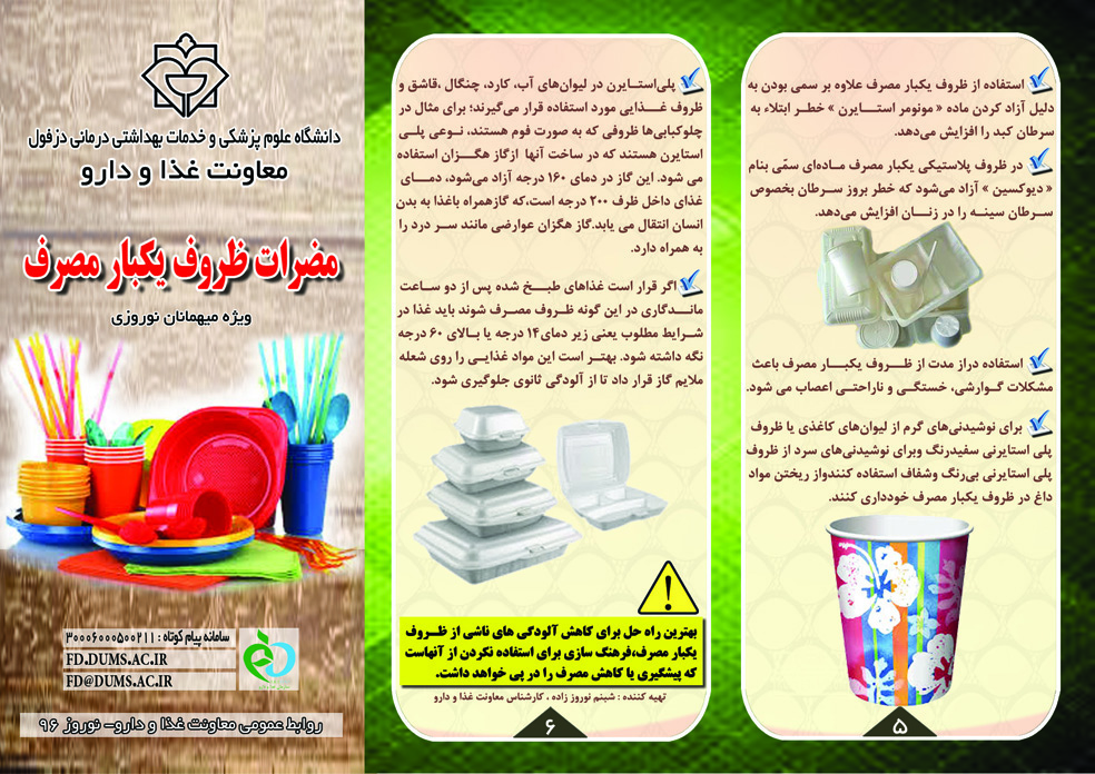 دکتر سلمان پور در خصوص ویژه نامه مضرات ظروف یکبار مصرف توضیح داد : امروزه استفاده بی رویه از محصولات ظروف یکبار مصرف به اوج خود رسیده است بدون اینکه از مضرات آن باخبر باشیم و یا فرهنگ درست مصرف کردن آنها را بیاموزیم به همین دلیل بر خود واجب دیدیم در ایام نوروز که مصرف ظروف یکبار مصرف به بیشترین حد خود می رسد نکات مهم علمی را به شهروندان و میهمانان نوروزی گوشزد کنیم .