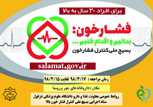وی در خاتمه اعلام کرد:طرح ملی بسیج کنترل فشارخون بالا برای افراد بالای 30 سال از روز جمعه 17 خردادماه شروع و تا روز شنبه 15 تیرماه 98 در برخی از داروخانه ها و کلیه مراکز درمانی،بهداشتی و پایگاههای شهری و روستایی و در شهرستان های دزفول،شوش و گتوند ادامه خواهد داشت.