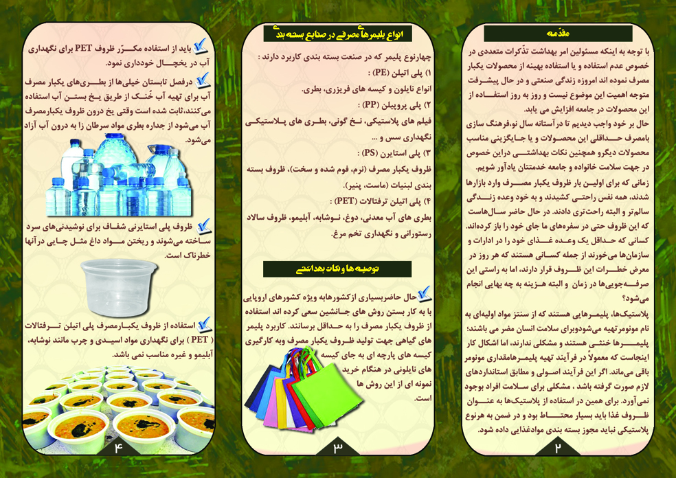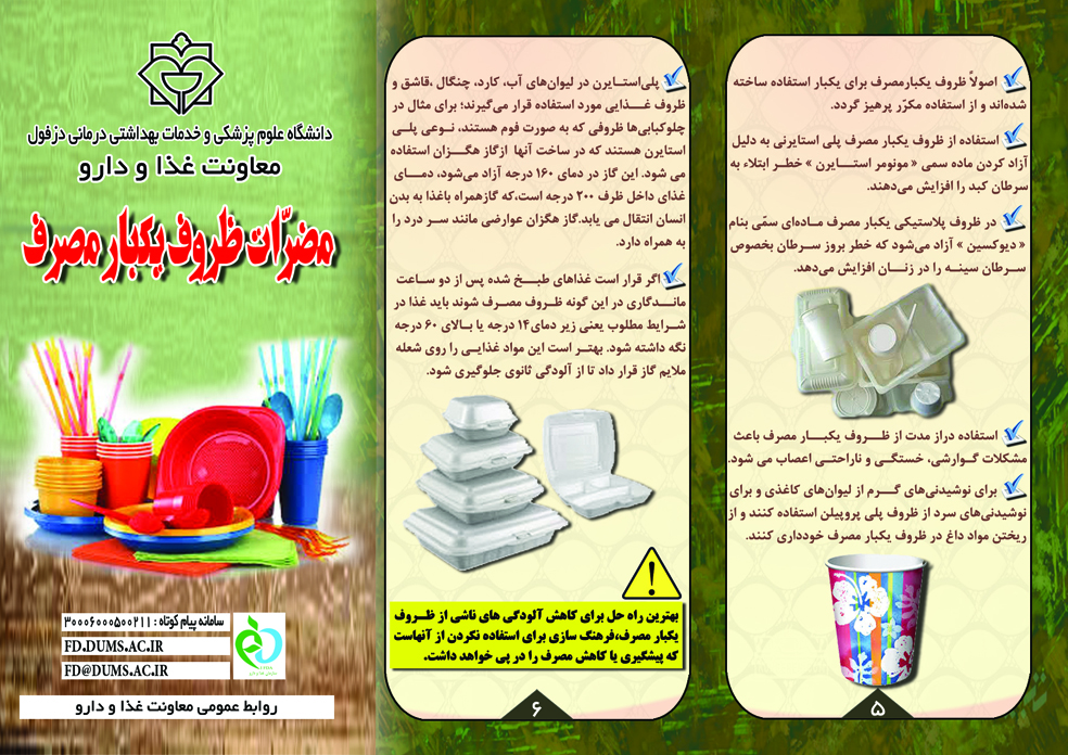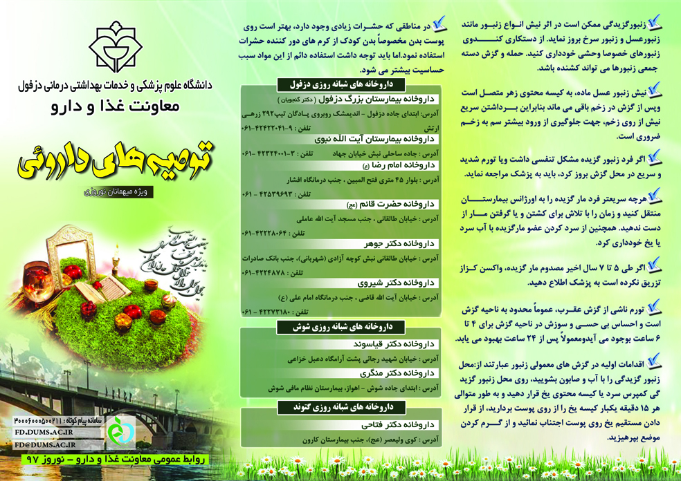 مسئول روابط عمومی معاونت غذا و دارو در خصوص طراحی و توزیع مطالب آموزشی ویژه میهمانان نوروزی 97 تشریح کرد: همچون سالهای گذشته برای میزبانی از میهمانان نورزی در سال 97 ،معاونت غذا و دارو دانشگاه علوم پزشکی دزفول اطلاعاتی شامل نام،آدرس و شماره های تماس داروخانه های شبانه روزی تحت پوشش دانشگاه علوم پزشکی دزفول را به همراه توصیه های داروئی در زمان سفر را در بروشوری تحت عنوان « توصیه های داروئی » و همچنین در بروشور دیگر مطالب آموزشی در خصوص « مضرارت استفاده از ظروف یکبار مصرف » را طراحی و به چاپ رسانیده است.
