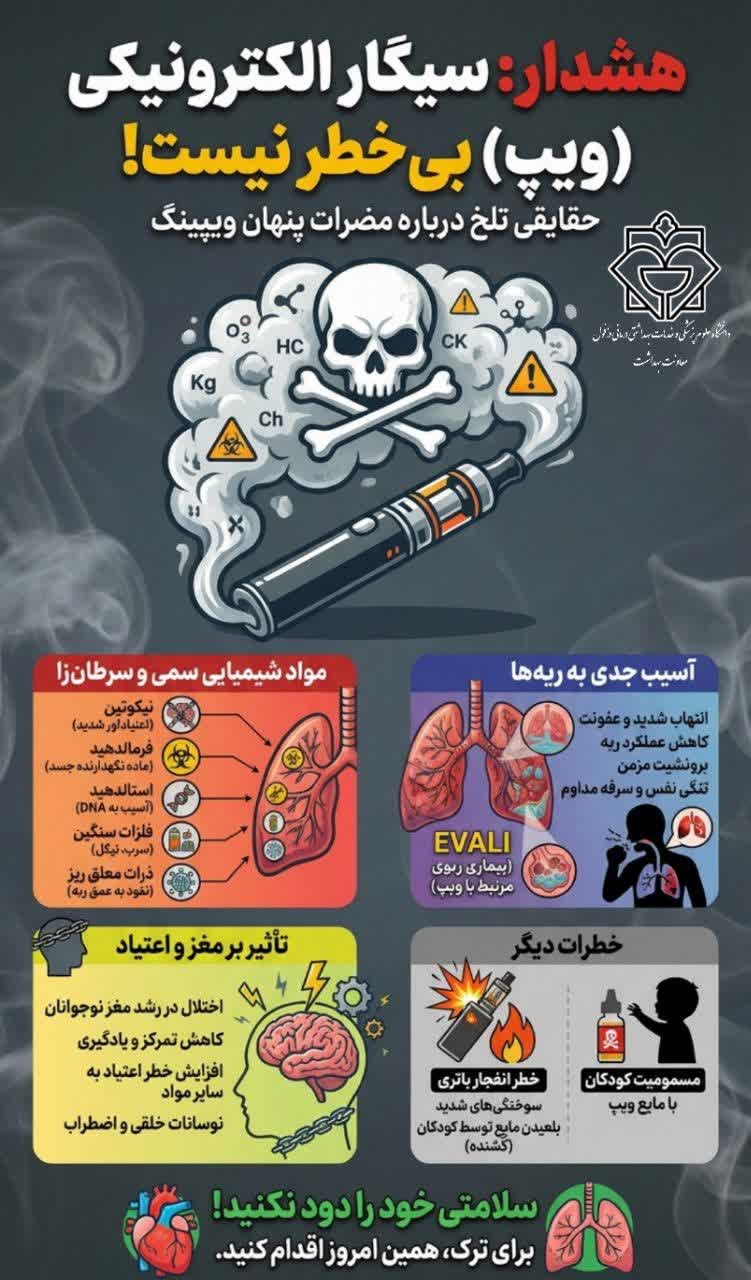 روابط عمومی معاونت بهداشت دانشگاه علوم پزشکی دزفول سلامتی خود را دود نکنید 1404/09/24 - 10:33 - تعداد بازدید: 10 - کد خبر : 19917 - گروه خبری : اخبار معاونت بهداشتی - تعداد نظرات : 0 حقایق تلخ درخصوص مضرات سیگارهای الکترونیکی