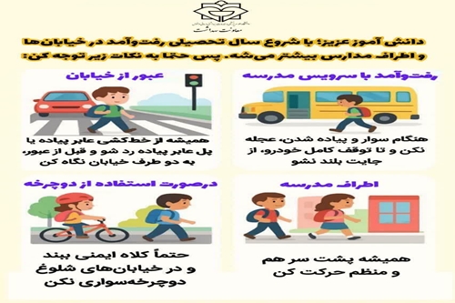 باتوجه به شروع سال تحصیلی جدید، رفت و آمد در خیابان ها بیشتر میشود، پس تلاش کنیم تا با رعایت اصول ایمنی، سال تحصیلی را به سلامت پشت سر بگذاریم.