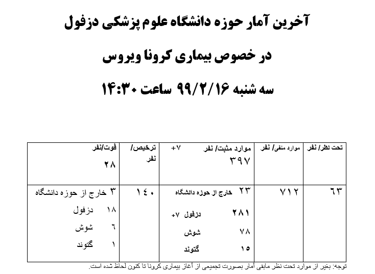 آخرین آمار حوزه دانشگاه علوم پزشکی دزفول در خصوص بیماری کرونا سه شنبه 16/2/99 ساعت 14:30