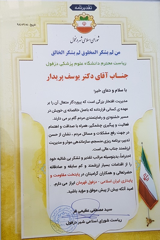 در ادامه این لوح تقدیر امده است تقدیر و تشکر بی شائبه خود را از اقدامات بسیار ارزشمند و کم سابقه و صادقانه جناب عالی و همکاران گرامیتان در پایتخت مقاومت و پایداری ایران اسلامی، دزفول قهرمان ابراز میدارم. دکتر یوسف پریدار رئیس دانشگاه علوم پزشکی دزفول متقابلا  از حسن توجه منتخبین مردم به تلاشهای همکاران خود در حوزه دانشگاه تشکر کرد.