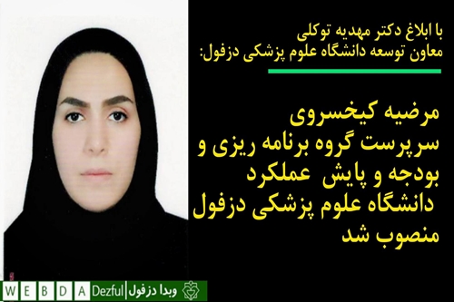 با ابلاغ معاون توسعه دانشگاه علوم پزشکی دزفول مرضیه کیخسروی به سرپرستی گروه برنامه ریزی بودجه و پایش عملکرد دانشگاه علوم پزشکی دزفول منصوب شد.