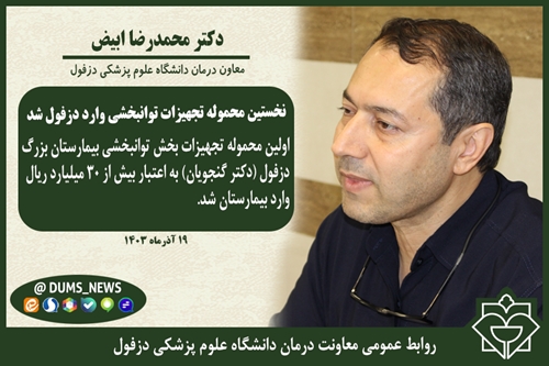 معاون درمان دانشگاه علوم پزشکی دزفول خبر داد: نخستین محموله تجهیزات توانبخشی به اعتبار بیش از 30 میلیارد ریال وارد بیمارستان بزرگ دزفول شد