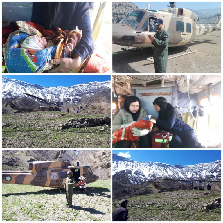 🚑پس از فرود بالگرد هوانیروز مسجد سلیمان در منطقه ی کدمه ، عملیات درمانی برای این مادر باردار شروع شده و پس از تولد نوزاد و انجام اقدامات بالینی جهت مادر و نوزاد و بریدن بندناف و عملیات گرم کردن نوزاد، مادر و نوزاد را با حال عمومی مساعد به بالگرد اورژانس هوایی دزفول منتقل کرده و جهت اقدامات بالینی تکمیلی به بیمارستان بزرگ دزفول (دکتر گنجویان) اعزام کردند. //پایان خبر