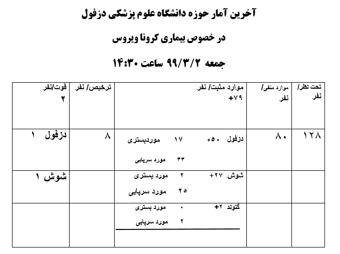 آخرین آمار حوزه دانشگاه علوم پزشکی دزفول در خصوص بیماری کرونا جمعه 2/3/99 ساعت 14:30