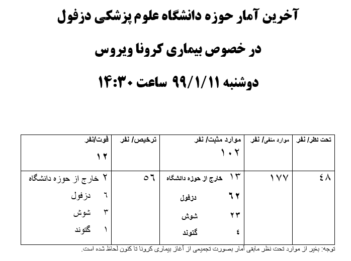 آخرین آمار حوزه دانشگاه علوم پزشکی دزفول در خصوص بیماری کرونا دوشنبه 11/1/99 ساعت 14:30
