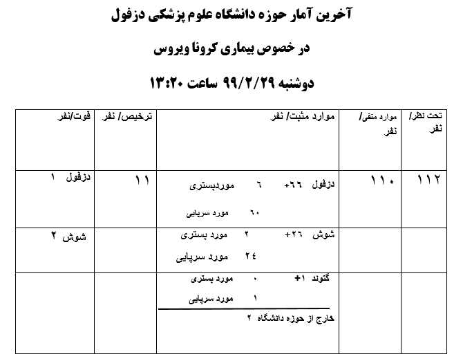 آخرین آمار حوزه دانشگاه علوم پزشکی دزفول در خصوص بیماری کرونا دوشنبه 29/2/99 ساعت 14:30