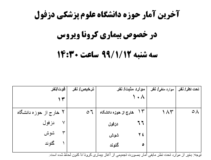 آخرین آمار حوزه دانشگاه علوم پزشکی دزفول در خصوص بیماری کرونا سه شنبه 12/1/99 ساعت 14:30