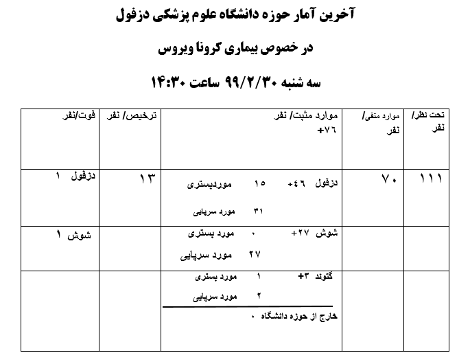 آخرین آمار حوزه دانشگاه علوم پزشکی دزفول در خصوص بیماری کرونا سه شنبه 30/2/99 ساعت 14:30
