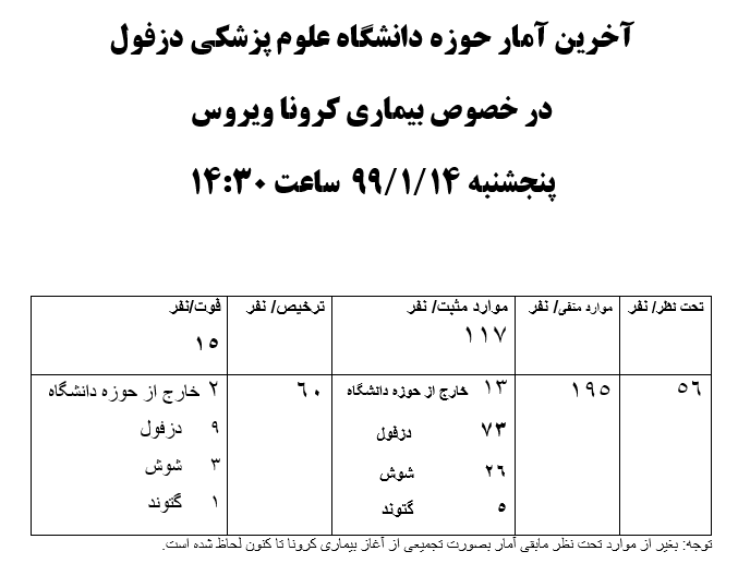 آخرین آمار حوزه دانشگاه علوم پزشکی دزفول در خصوص بیماری کرونا پنجشنبه 14/1/99 ساعت 14:30