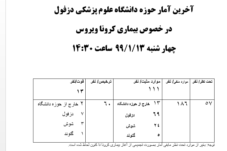 آخرین آمار حوزه دانشگاه علوم پزشکی دزفول در خصوص بیماری کرونا چهارشنبه 13/1/99 ساعت 14:30