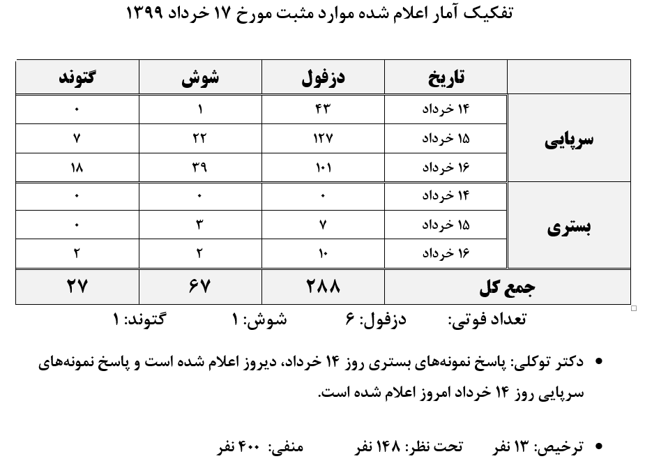 آخرین آمار حوزه دانشگاه علوم پزشکی دزفول، بیماری کرونا شنبه 17/3/99 ساعت 14:30