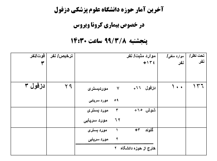 آخرین آمار حوزه دانشگاه علوم پزشکی دزفول، بیماری کرونا پنجشنبه 8/3/99 ساعت 14:30