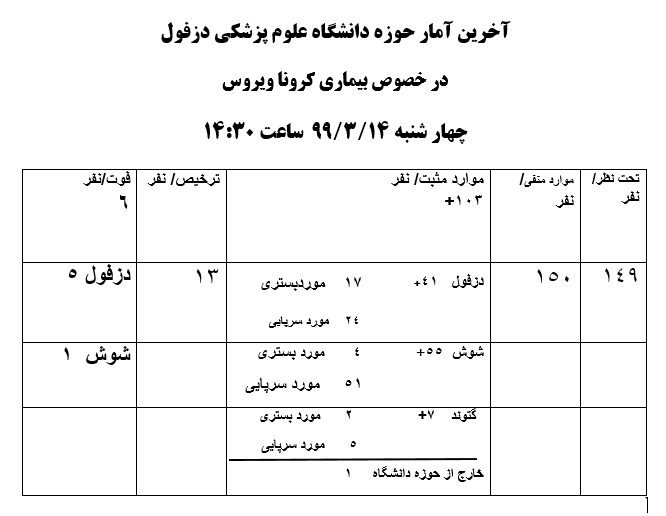 آخرین آمار حوزه دانشگاه علوم پزشکی دزفول، بیماری کرونا چهار شنبه 14/3/99 ساعت 14:30