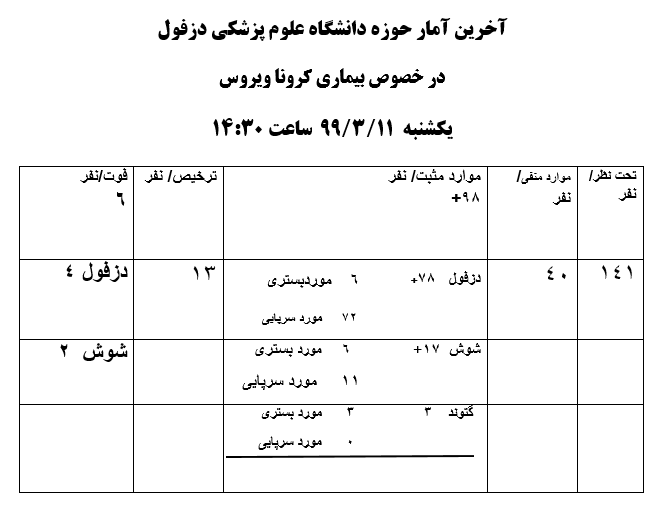 آخرین آمار حوزه دانشگاه علوم پزشکی دزفول، بیماری کرونا یکشنبه 11/3/99 ساعت 14:30