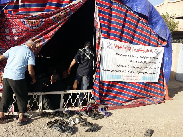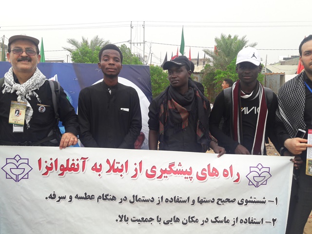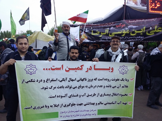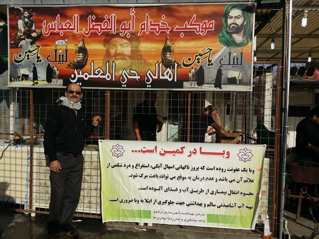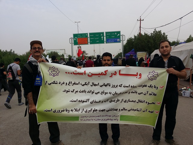 تیم آموزشی به سرپرستی دکتر محمدعلی مهدویان معاون فنی مرکز بهداشت شهرستان دزفول در مسیر پیاده روی و موکب ها به آموزش و پیشگیری از بروز و شیوع بیماری های التور و آنفولانزا در زایرین کربلای معلی پرداختند