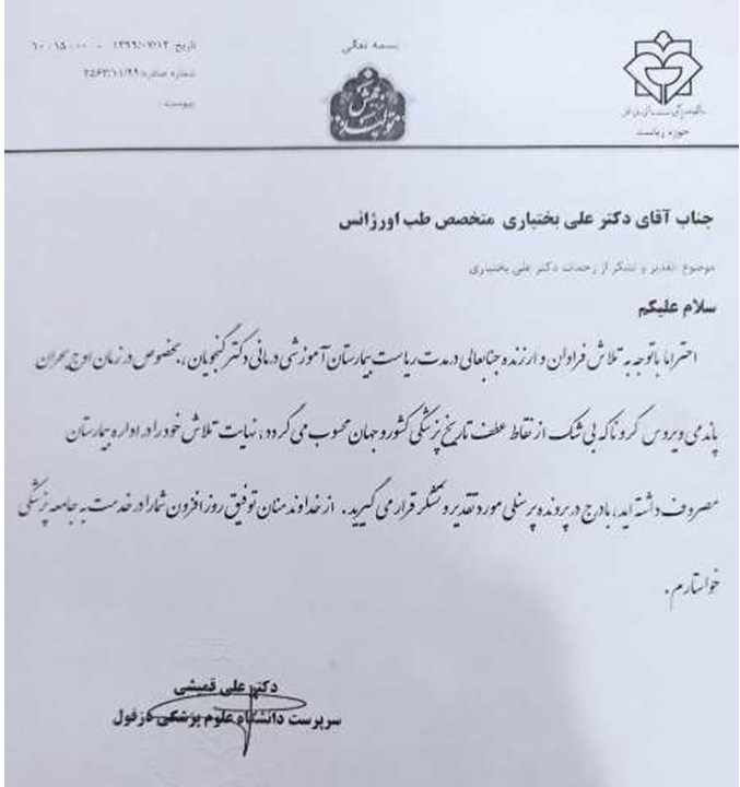 با ارسال نامه رئیس دانشگاه علوم پزشکی دزفول