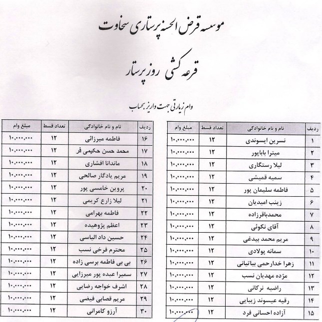اسامی30 نفرازپرستاران درقرعه کشی موسسه مالی قرض الحسنه پرستاری سخاوت بمناسبت میلادحضرت زینب س وروزپرستار،اعلام شد