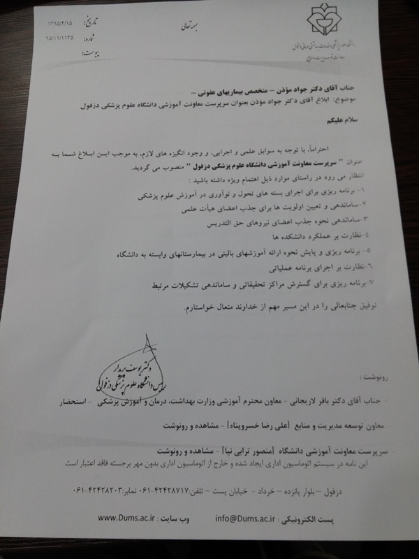 دکتر یوسف پریدار رئیس دانشگاه علوم پزشکی دزفول طی ابلاغی دکتر جواد موذن را بعنوان سرپرست معاونت آموزشی دانشگاه علوم پزشکی دزفول منصوب کرد. این ابلاغ که در هفت بند تنظیم شده است.