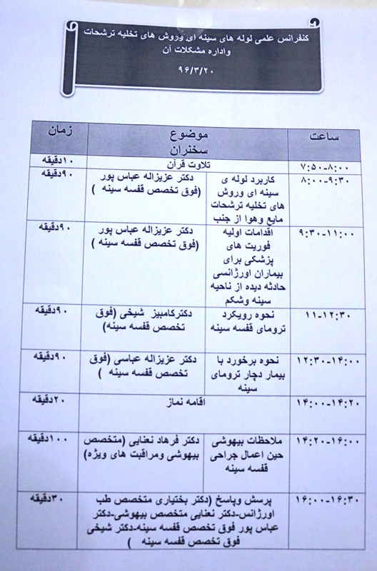 کنفرانس علمی لوله های سینه ای وروشهای تخلیه واداره مشکلات وعوارض باتوجه به نیازسنجی وموارد فراوان بیماران مراجعه کننده به مرکزدرمانی بیمارستان بزرگ دزفول برای گروه های هدف شامل پزشکان گروه جراحی،پزشکان عمومی وپرستاران برنامه ریزی و هماهنگ شد که با همکاری مرکز آموزش مداوم دانشگاه علوم پزشکی دزفول توسط معاونت آموزشی بیمارستان بزرگ دزفول و باتایید مرکزآموزش مداوم دانشگاه علوم پزشکی اهواز در سالن ولایت برگزار گردید .