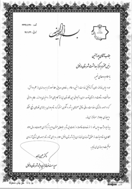 همچنین در پایان جلسه از زحمات مرکز بهداشت شهرستان دزفول بعنوان دبیر برتر برگزاری جلسات در سال 1396 و همکاری با ستاد صیانت از حقوق شهروندی فرمانداری ویژه شهرستان دزفول با اهدای لوح از طرف دکتر عیسی زاده تقدیر و تشکر بعمل آمد.
