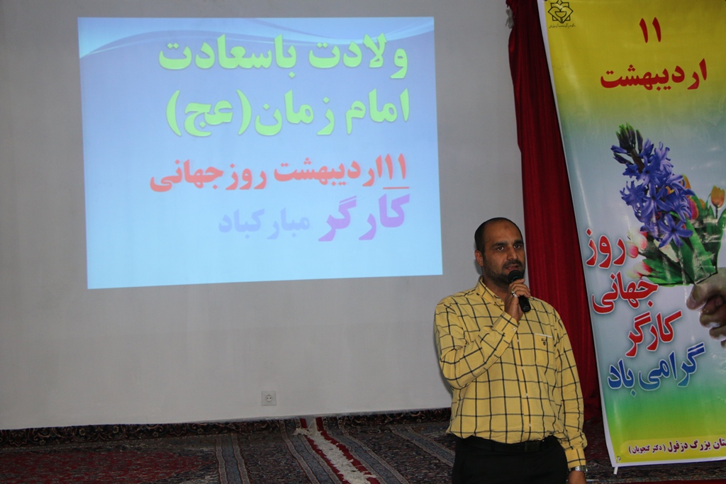 11اردیبهشت باحضوردکترتبرک پورریاست وسایرمسولین،مراسم جشن روزکارگرباشرکت کارکنان وکارگران بیمارستان بزرگ دزفول وبااجرای برنامه های شاددرسالن ولایت برگزارشد.