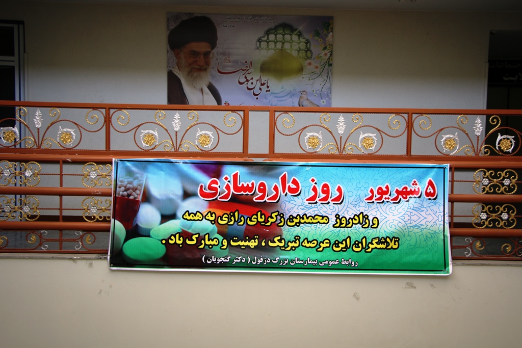 دکترعلی بختیاری مسول فنی ومعاون آموزشی بیمارستان بزرگ دزفول بمناسبت 5شهریورزادروزمحمدزکریای رازی دانشمندایران زمین،شیمیدان وکاشف الکل ونیزروزداروسازی ازداروسازان بیمارستان تجلیل کرد.
